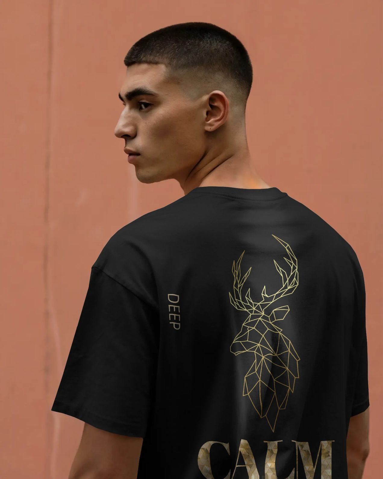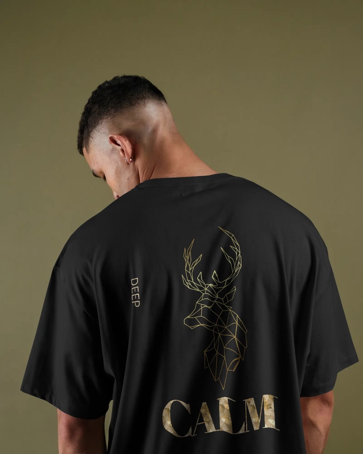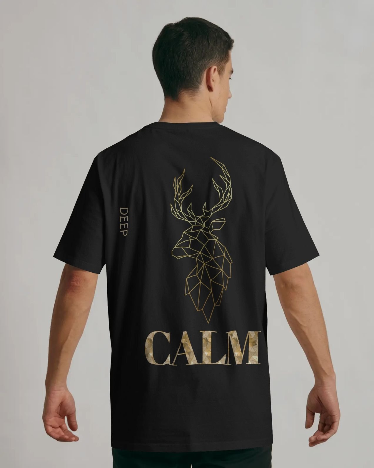 The deer—symbolizing strength, focus, and calm awareness—is placed centrally on the back, paired with the bold yet subtle CALM typography and minimal vertical “DEEP” text detail. The contrast of metallic gold tones against a deep black base creates a luxurious, modern aesthetic that stands out without being loud.