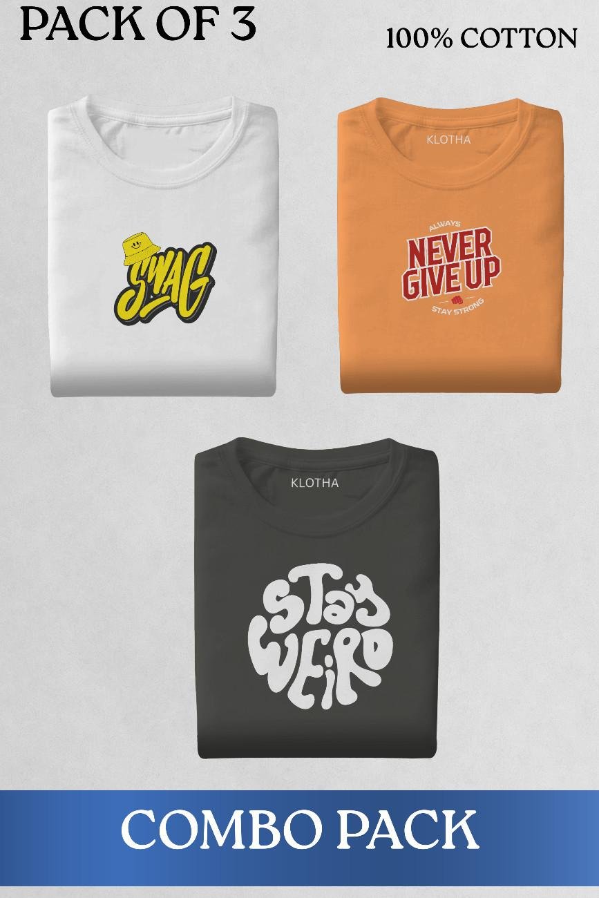 Stay stylish every day with this Pack of 3 Graphic T-Shirts, made from 100% breathable cotton. Featuring bold prints like Swag, Never Give Up, and Stay Weird, this combo delivers comfort, confidence, and casual street style.