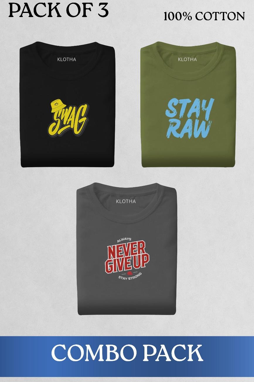 Level up your casual style with this Pack of 3 Graphic T-Shirts, made from 100% soft cotton. Featuring bold prints like Swag, Stay Raw, and Never Give Up, this combo delivers comfort, confidence, and everyday style.
