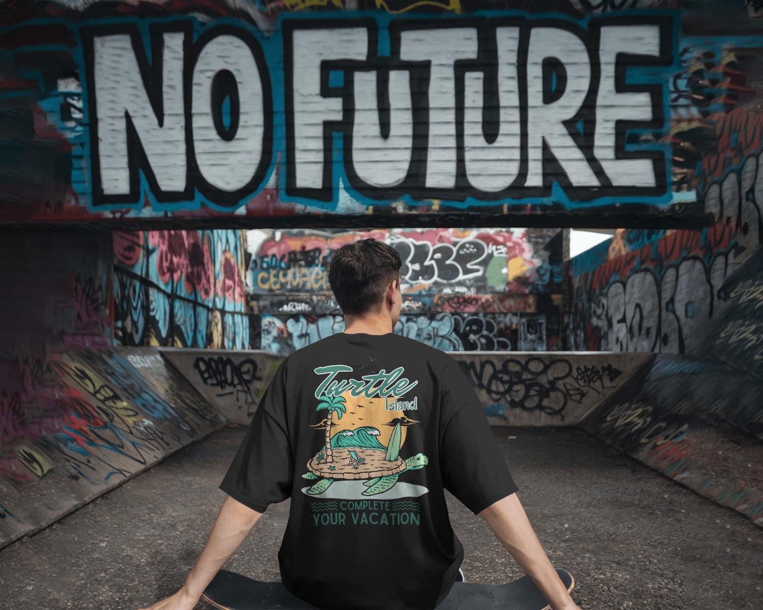 The Turtle Island Vacation T-Shirt features a bold, vintage-inspired beach illustration with palms, waves, and a chill turtle motif. The relaxed graphic and playful “Complete Your Vacation” slogan instantly create tropical holiday vibes — whether you’re actually traveling or just dreaming about it.